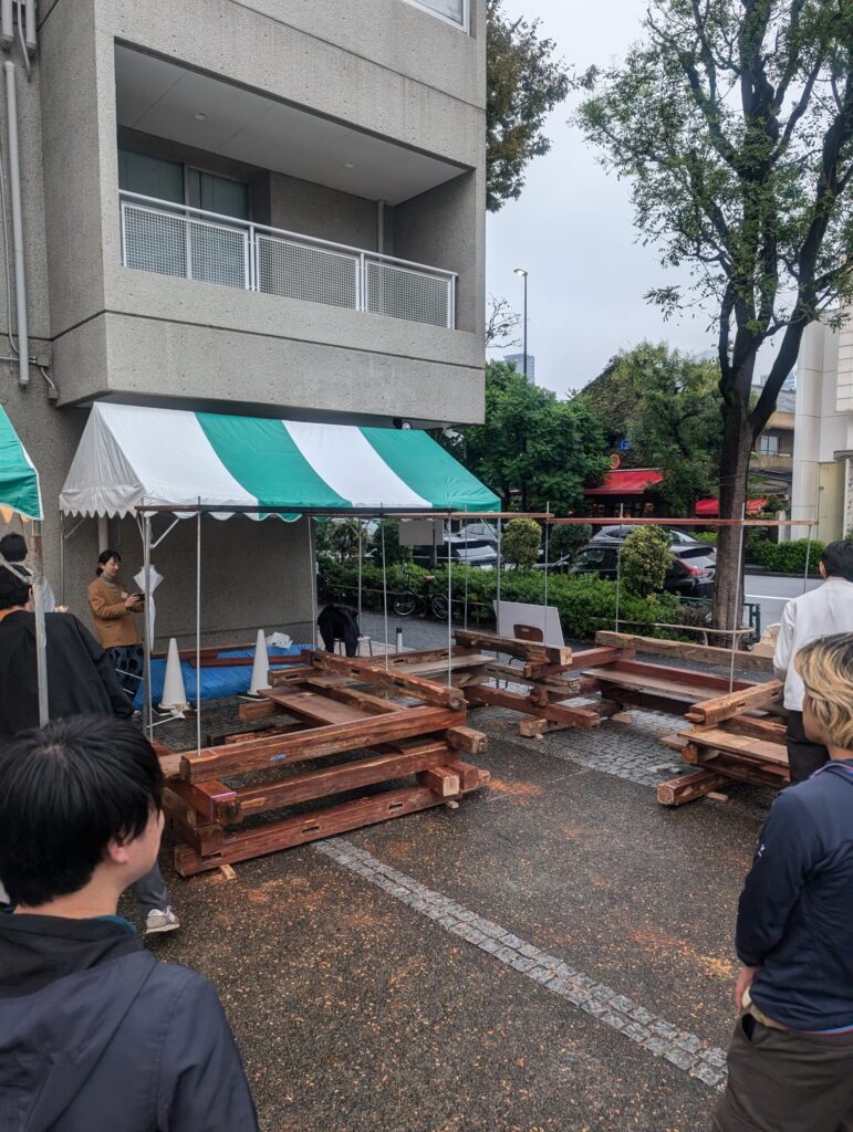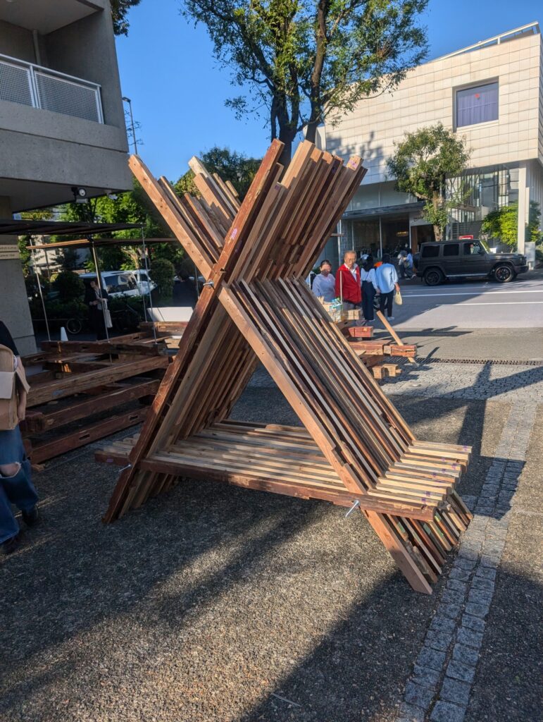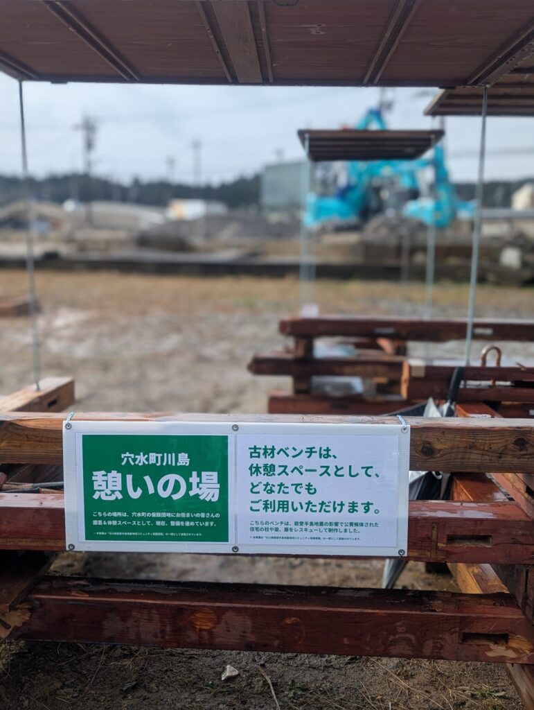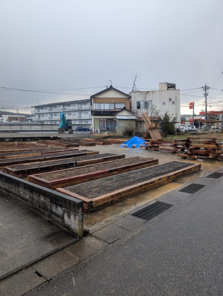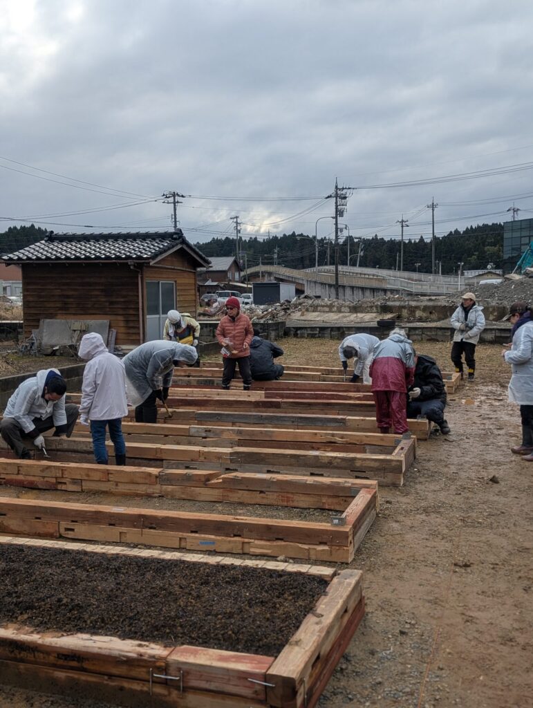 11月末に行われた第二弾では、さらに5区画の木枠を追加。あいにくの雨でしたが、仮設住宅にお住まいの方々もたくさん集まってくださり、あっという間に完成しました。 完成した木枠を眺めると、一本一本表情の違う古材が組み合わさっていて、なんとも言えない面白さがあります。 前回作ったベンチに、住民の方やボランティアさんが腰掛けて談笑している姿を見て、ここが着実に「みんなの居場所」になっていることを実感しました。