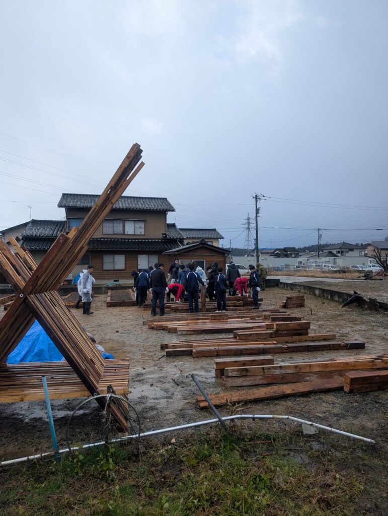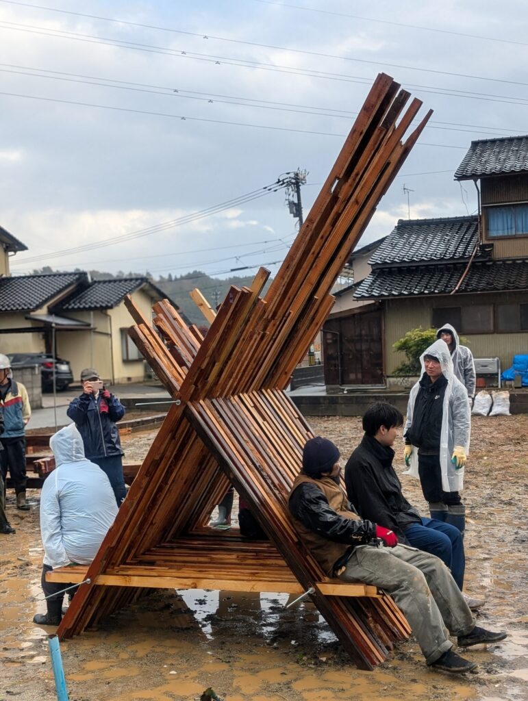 第一弾では、千葉学建築計画事務所による洗練されたデザインのベンチ2台と、3区画の菜園用木枠(畝)を設置しました。 東京・代官山で一度形になったベンチが、能登でレスキューされた古材を纏い、再びこの地で組み立てられる。古材の持つ深い味わいとモダンなデザインが融合した、とても格好いい休憩場所が誕生しました。